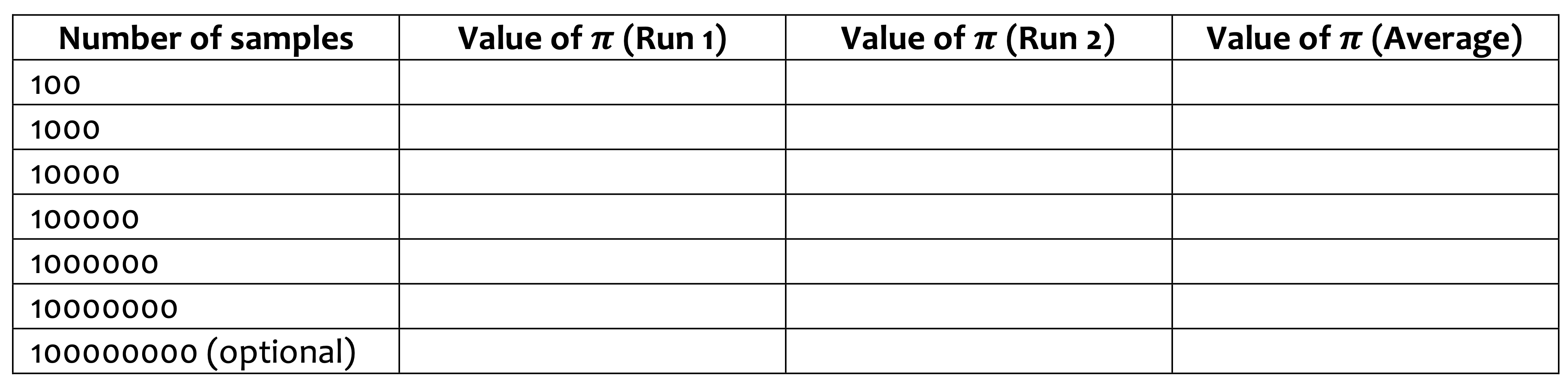 \(\pi\) has fascinated mathematicians since the ancient times. Pick any sufficiently advanced ancient civilization and you will find a mention of \(\pi\). Knowing the value of \(\pi\) is useful in many domains, most notably among them is astronomy. That is why perhaps the ancients were so fascinated with its value. In this assignment you are asked to calculate the value of \(\pi\) using random sampling. Random sampling is used in many places where exact analytical solutions are too difficult to compute. This is just one instance of such a scenario.